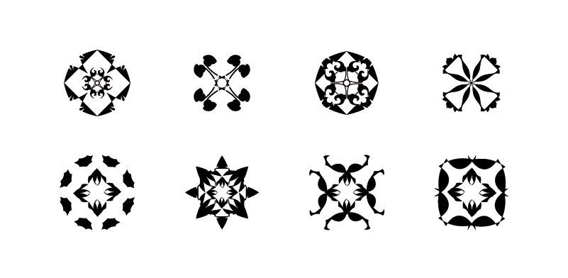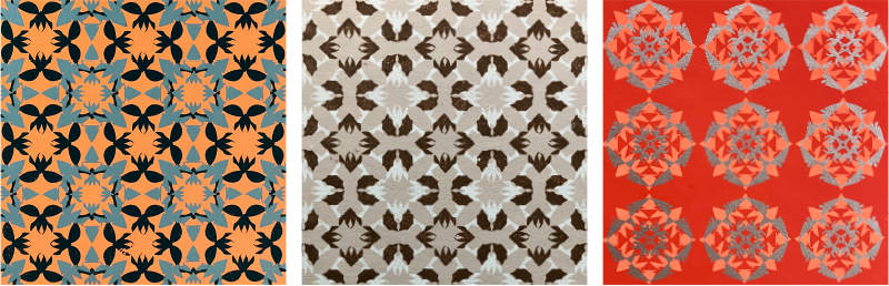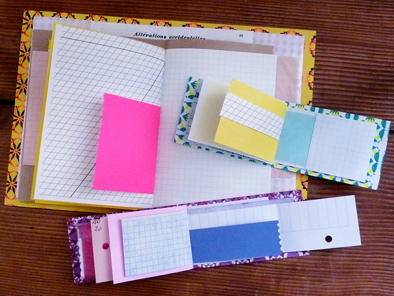 J'ai créé 8 motifs de base pour illustrer les couvertures. En les superposant par deux, avec ou sans décalages, il y a 112 permutations possibles...multiplié par une infinité de combinaisons colorimétriques, on obtient une identité visuelle très distinctive, reconnaissable au premier coup d'oeil, tout en conservant le caractère absolument unique de chaque carnet.