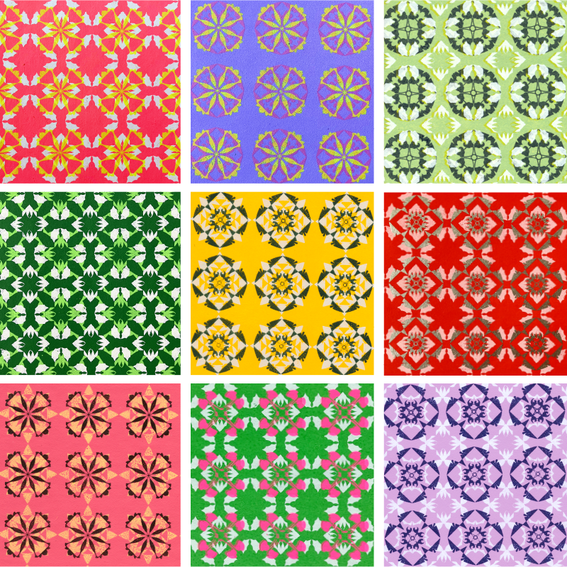 Le concept de la marque étant qu'un même motif ne puisse pas se répéter sur un même format, avec la même colorimétrie, j'ai réalisé un gabarit de découpe des planches de motifs sans répétitions, ni perte de matière, ainsi qu'un système de rotation d'impression des cadres de sérigraphie. Ces principes, ont permis de conserver une fluidité de production qui permet la rentabilité du projet.